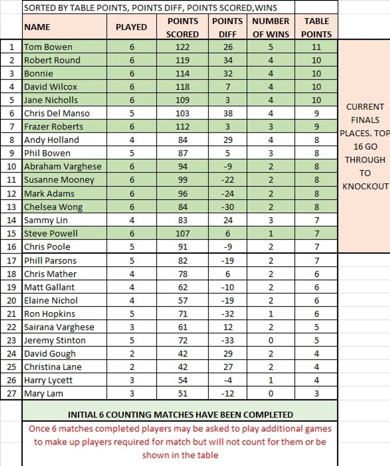 The Finals night will be a knockout competition based on the best of 3 games, first to 21 points each game.